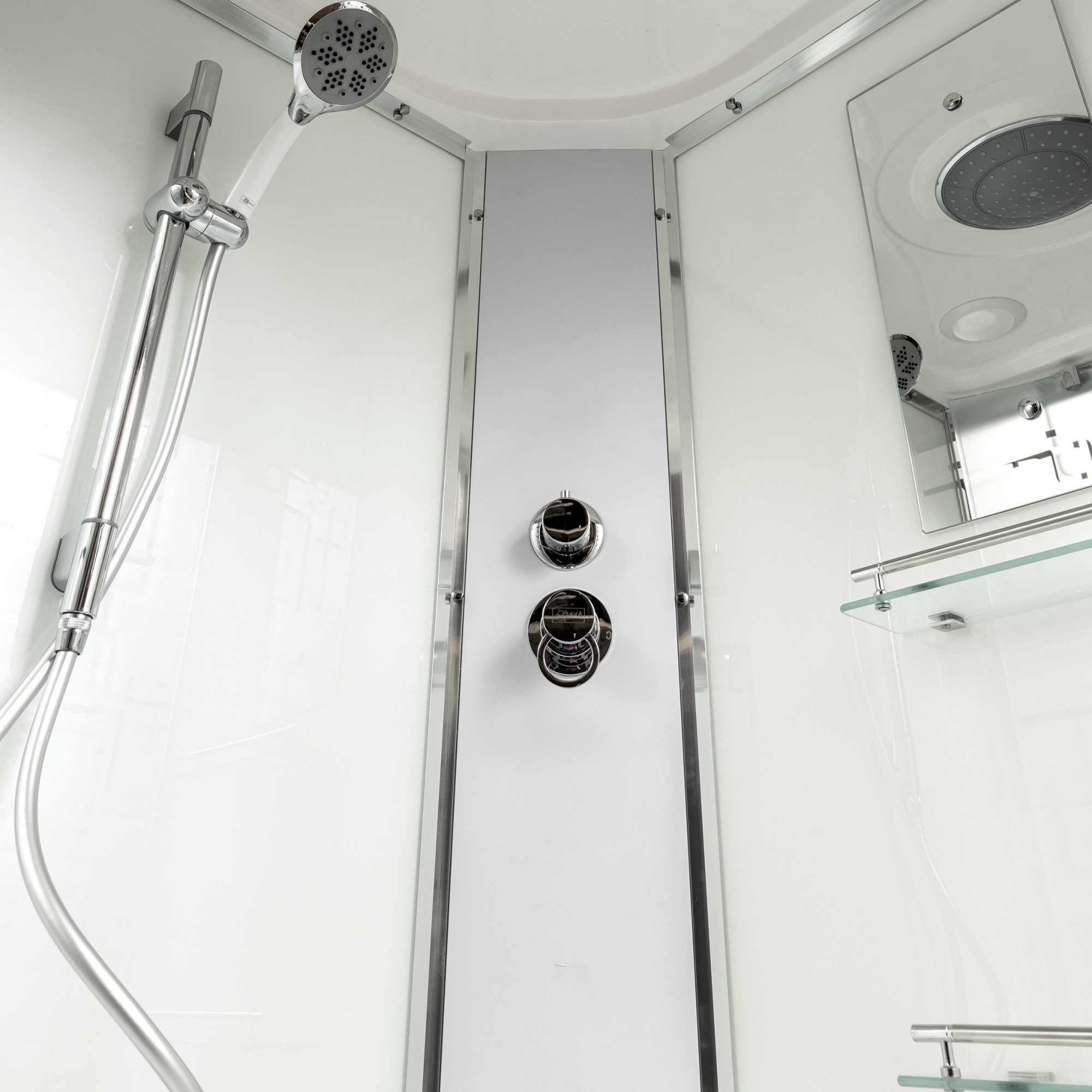 Донный клапан (клик-клак) / Зеркало / Переключатель режимов / Полочки / Смеситель / Тропический (верхний) душ