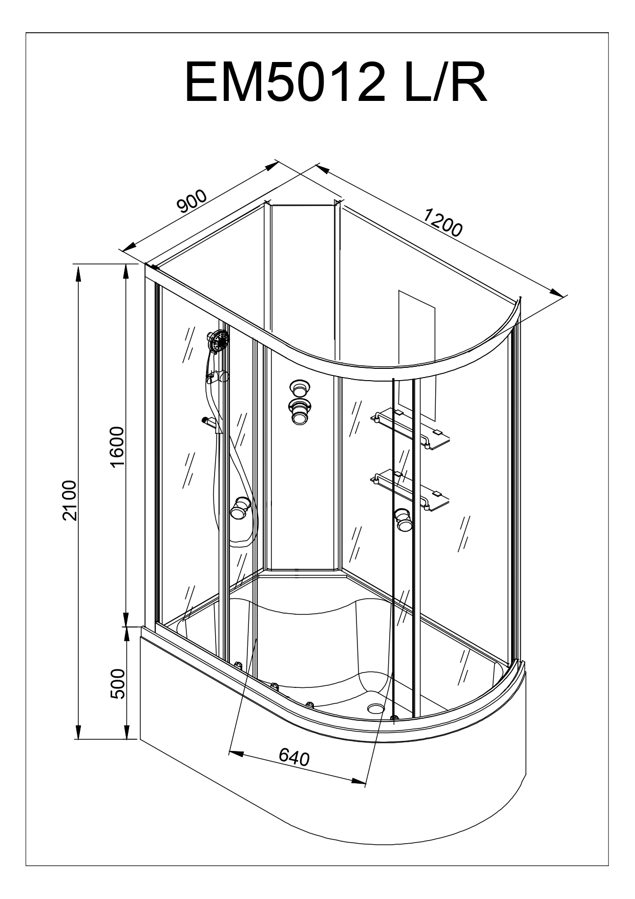 Стильная душевая кабина с внутренней сборкой AvaCan EM5012 N L LED сочетает в себе высокую функциональность, практичность и надежность. Для изготовления применяют безопасное закаленное стекло толщиной 5 мм, надежно фиксируемое алюминиевым профилем. Цвет профиля хром. В комплекте зеркало, донный клапан (клик-клак), душевой гарнитур, полочки.