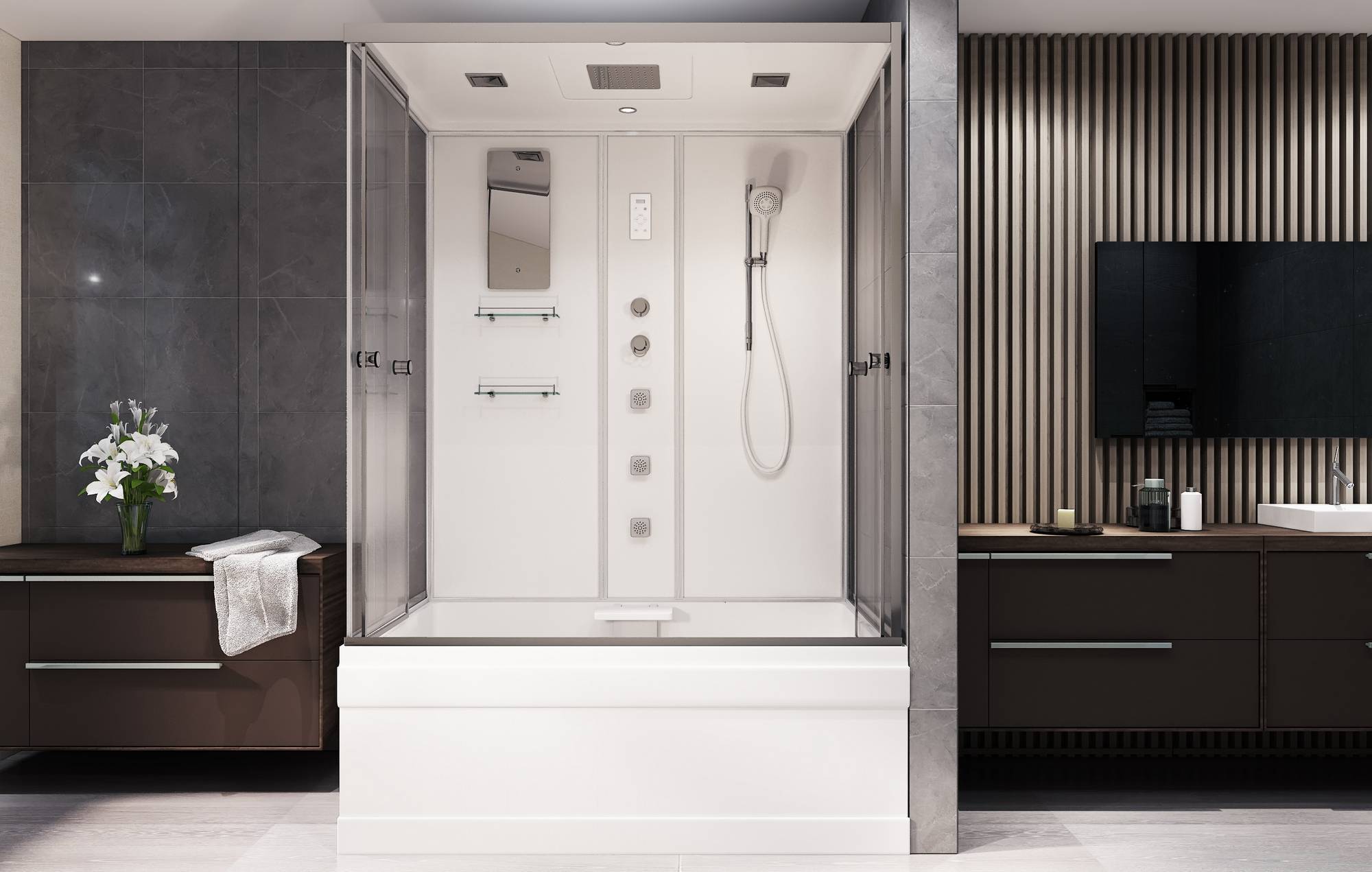 Стильная душевая кабина с внутренней сборкой AvaCan V150 сочетает в себе высокую функциональность, практичность и надежность. Для изготовления применяют безопасное закаленное стекло толщиной 5 мм, надежно фиксируемое алюминиевым профилем. Цвет профиля хром. В комплекте зеркало, сенсорный пульт управления, гидромассажные форсунки, смеситель, переключатель режимов, вентиляция, радио.