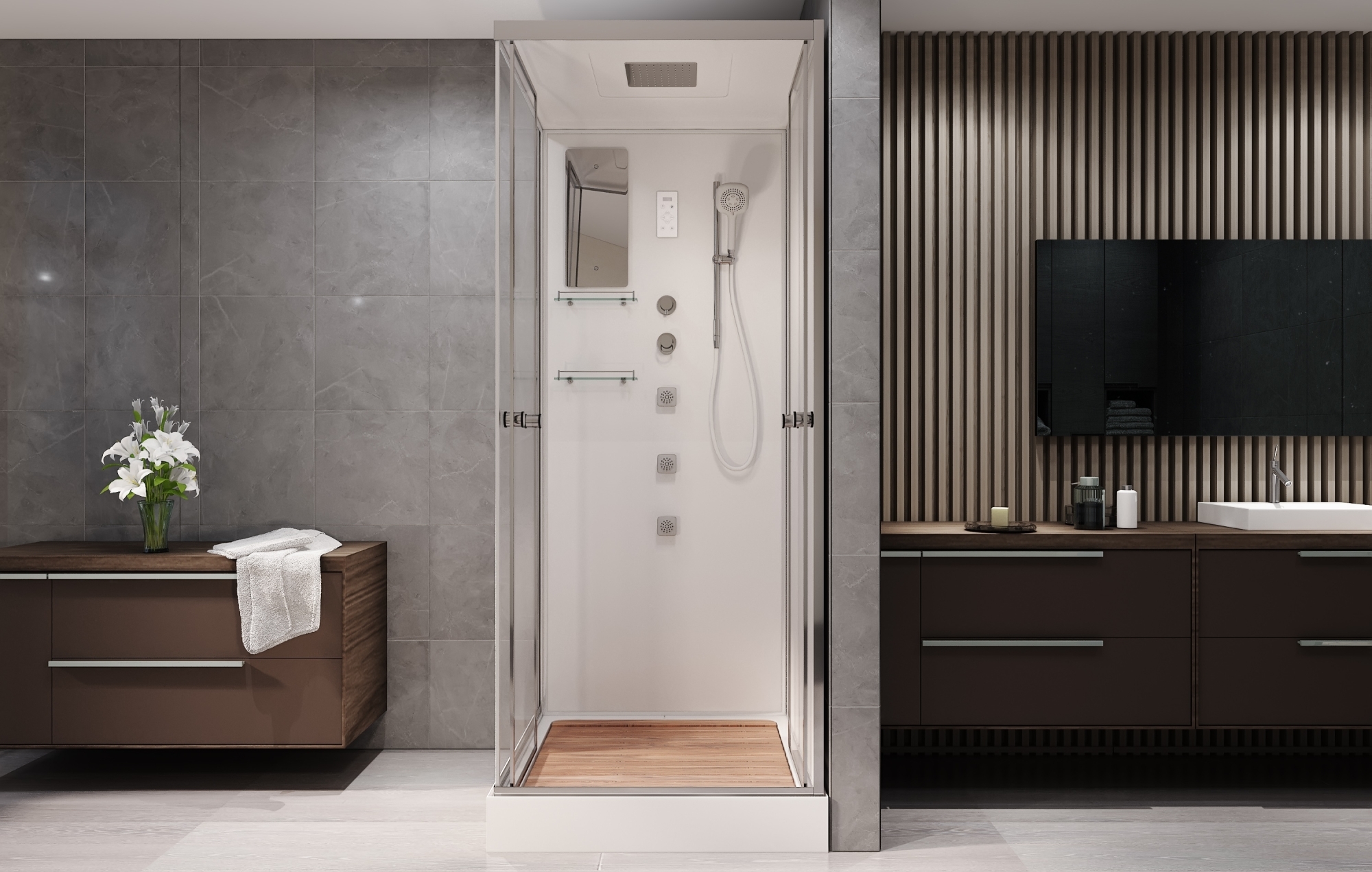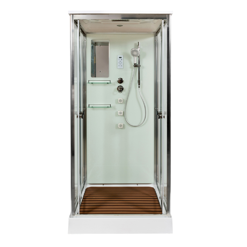 Стильная душевая кабина с внутренней сборкой AvaCan V8015 сочетает в себе высокую функциональность, практичность и надежность. Для изготовления применяют безопасное закаленное стекло толщиной 6 мм, надежно фиксируемое алюминиевым профилем. Цвет профиля хром. В комплекте зеркало, сенсорный пульт управления, передний съемный экран, душевой гарнитур, смеситель, тропический (верхний) душ, переключатель режимов, вентиляция, полочки, гидромассажные форсунки, откидное сиденье, тропический (верхний) душ, вентиляция, радио, деревянная вставка в поддон.