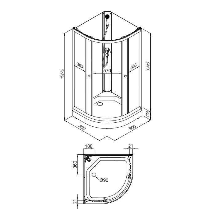 Смеситель, ручной душ, поддон, сифон, верхний душ