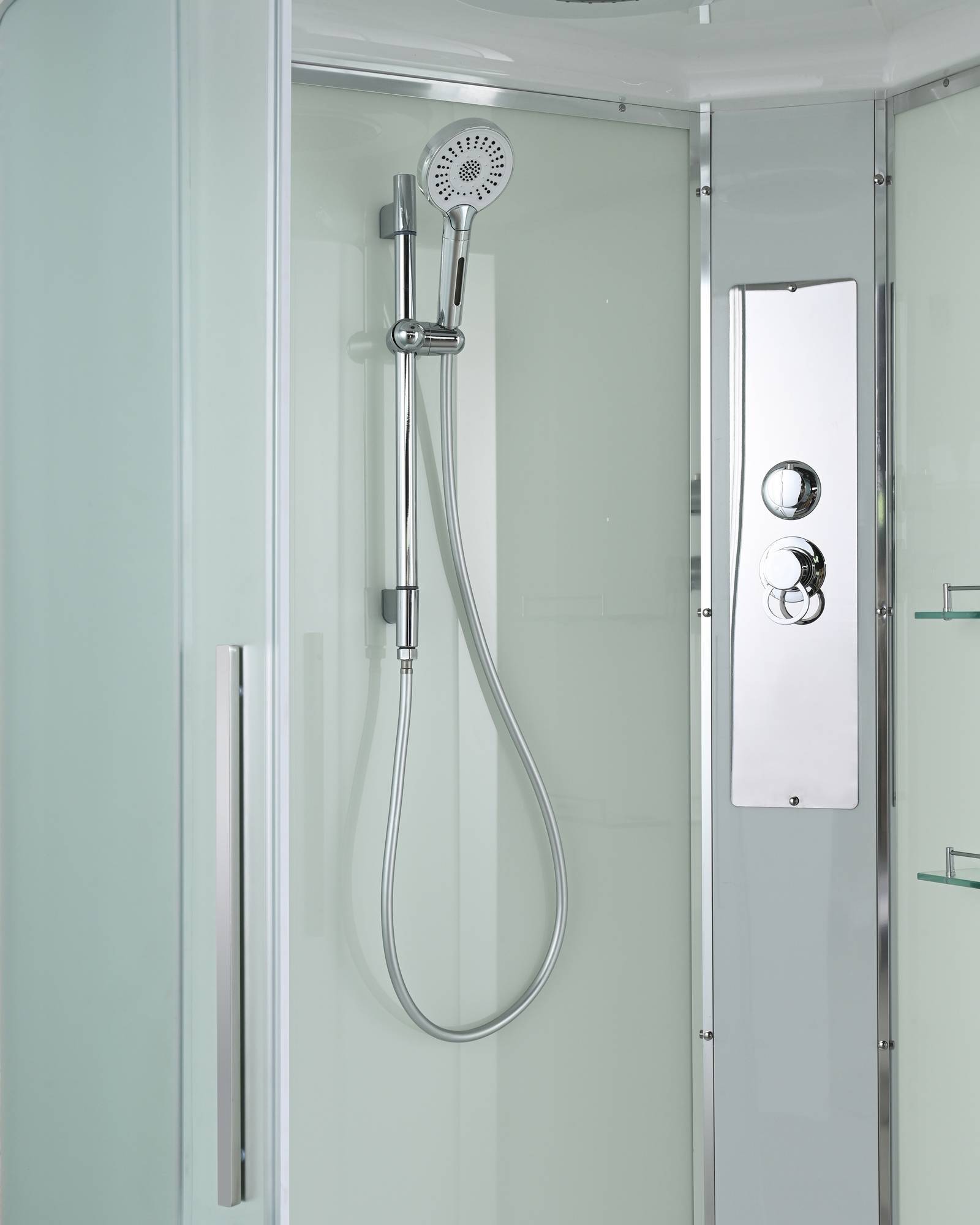 /сифон/ Переключатель режимов /2-е Полочки /резьбовой смеситель / Тропический (верхний) душ/ручки дверей из нержавейки /арома-лейка с витамином С/ Душевая штанга