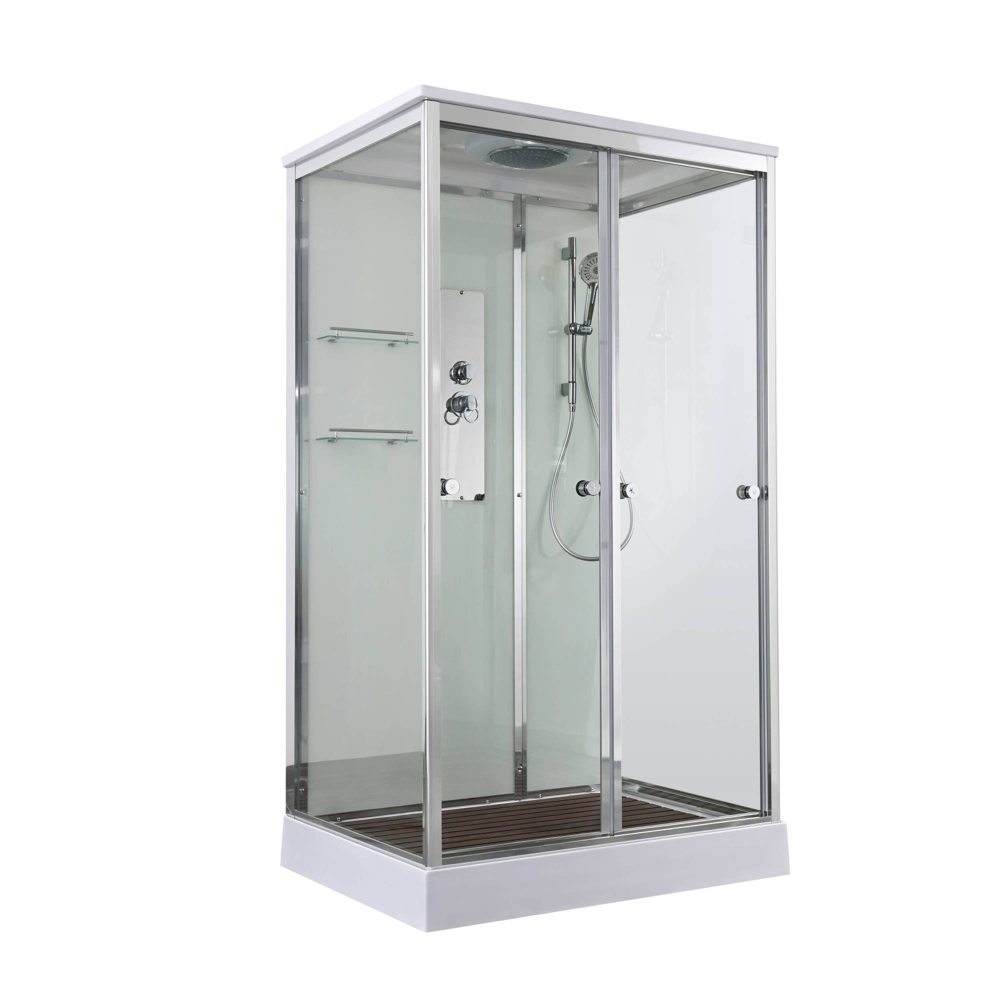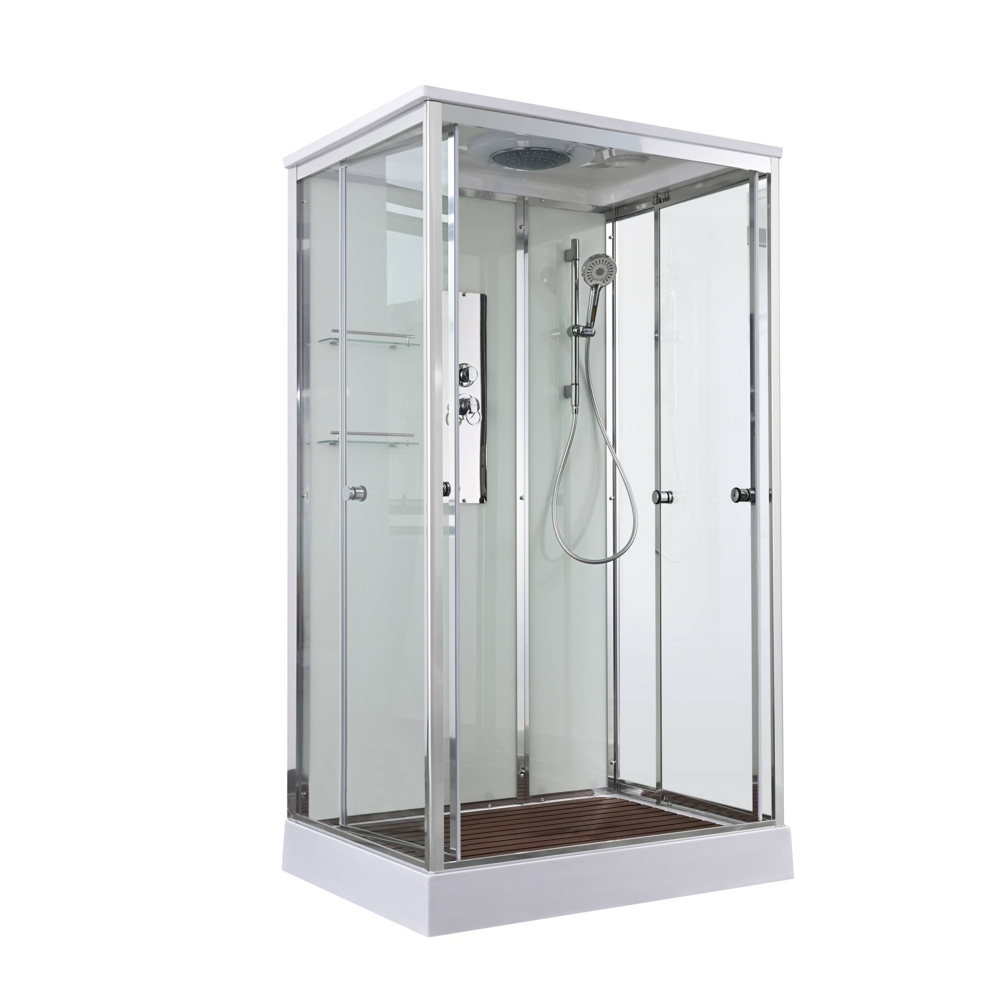 полимерная вставка в поддон(имитация дерева)/сифон/ Переключатель режимов /2-е Полочки /резьбовой смеситель / Тропический (верхний) душ/ручки дверей /арома-лейка с витамином С/ Душевая штанга