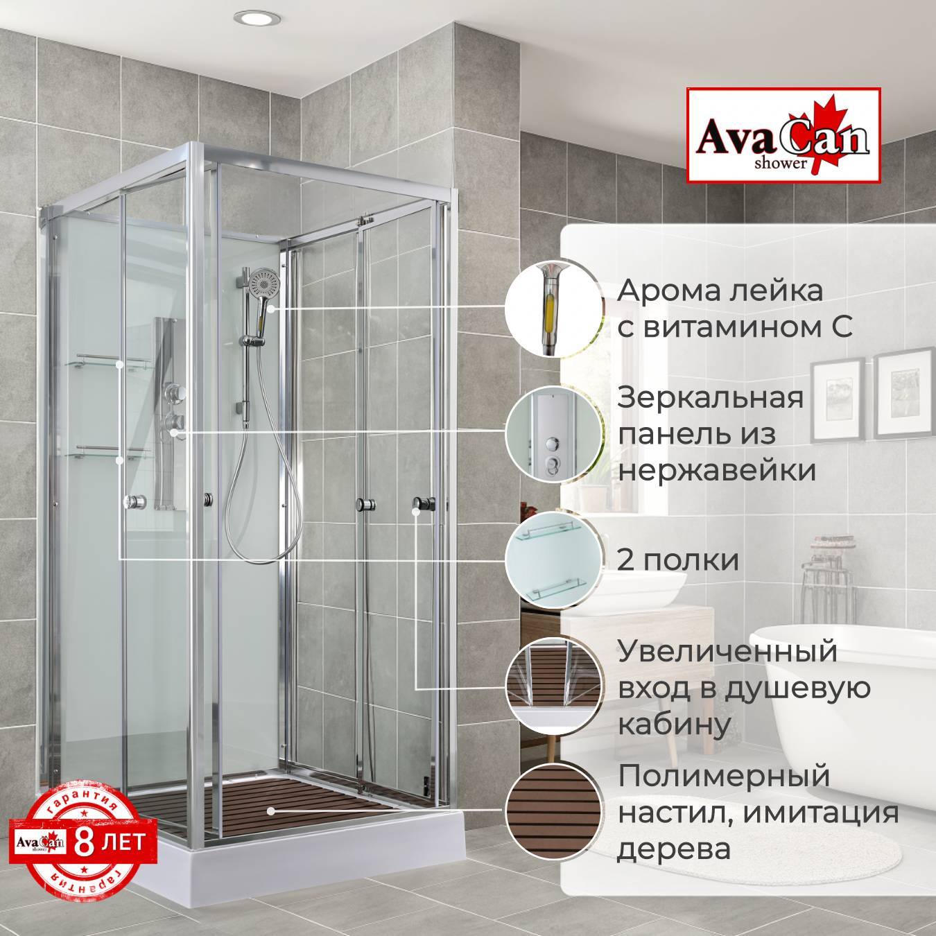 Стильная душевая кабина AvaCan сочетает в себе высокую функциональность, практичность и надежность. При изготовлении применяется безопасное закаленное стекло, надежно фиксируемое алюминиевым профилем. Профиль сделан из алюминия повышенной прочности. Сборка без силикона (увеличивает срок службы, защищает от протечек), внутренняя сборка (облегчает установку и ревизию; позволяет установить в ограниченном пространстве и обойтись без демонтажа других сантехнических приборов), смеситель резьбовой (без хомутов). Двойные металлические ролики дверей (распределение нагрузки на два ролика, увеличивают срок службы). Душевая штанга(позволяет регулировать по высоте ручную лейку), ручная арома-лейка с витамином С (картридж в комплекте,есть возможность замены или удаления картриджа), полочки(из стекла, с ограничителем), сифон с гидрозатвором.