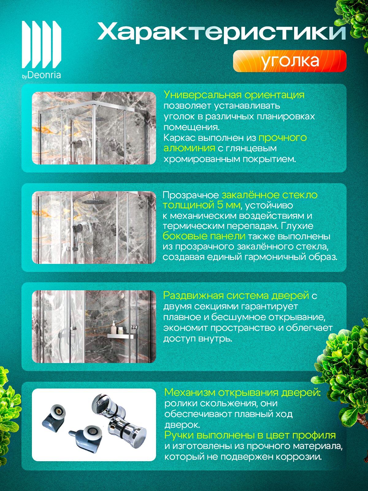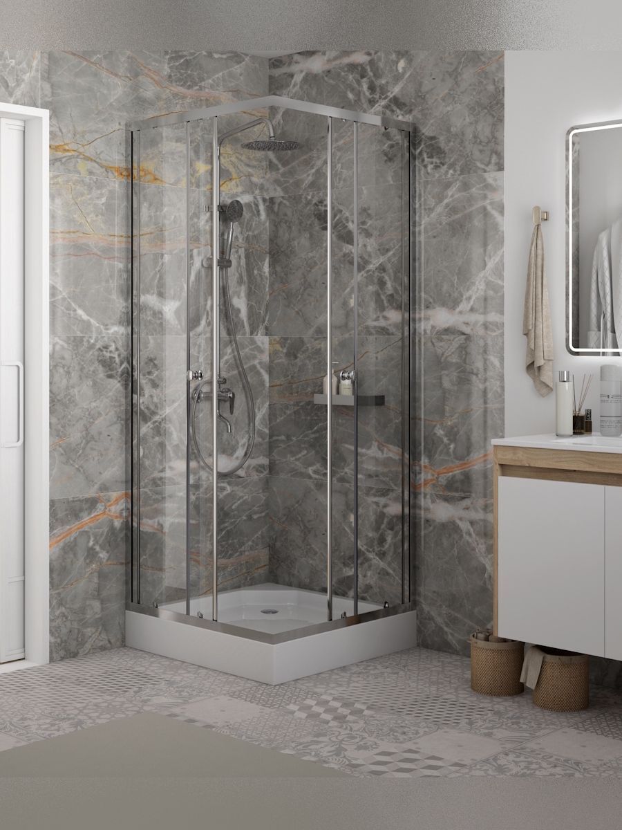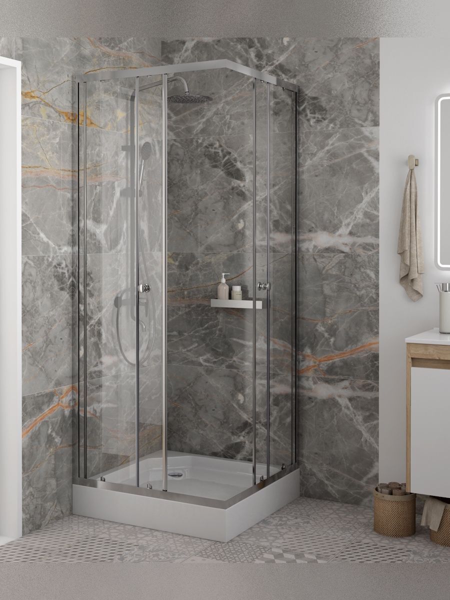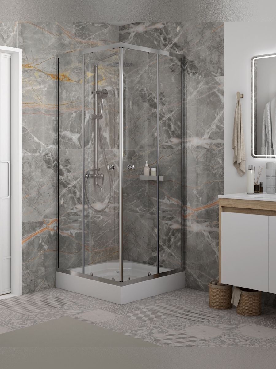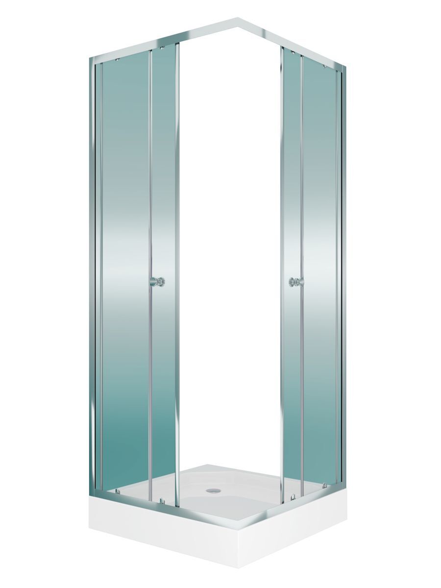Профиль 1850х30х25 - 2 шт., профиль 830х40х17 - 4 шт., поддон акриловый - 1 шт., сифон клик-клак - 1 шт., стекло глухое - 2 шт., стекло дверное - 2 шт., силиконовый уплотнитель, крепеж, ролики, документация